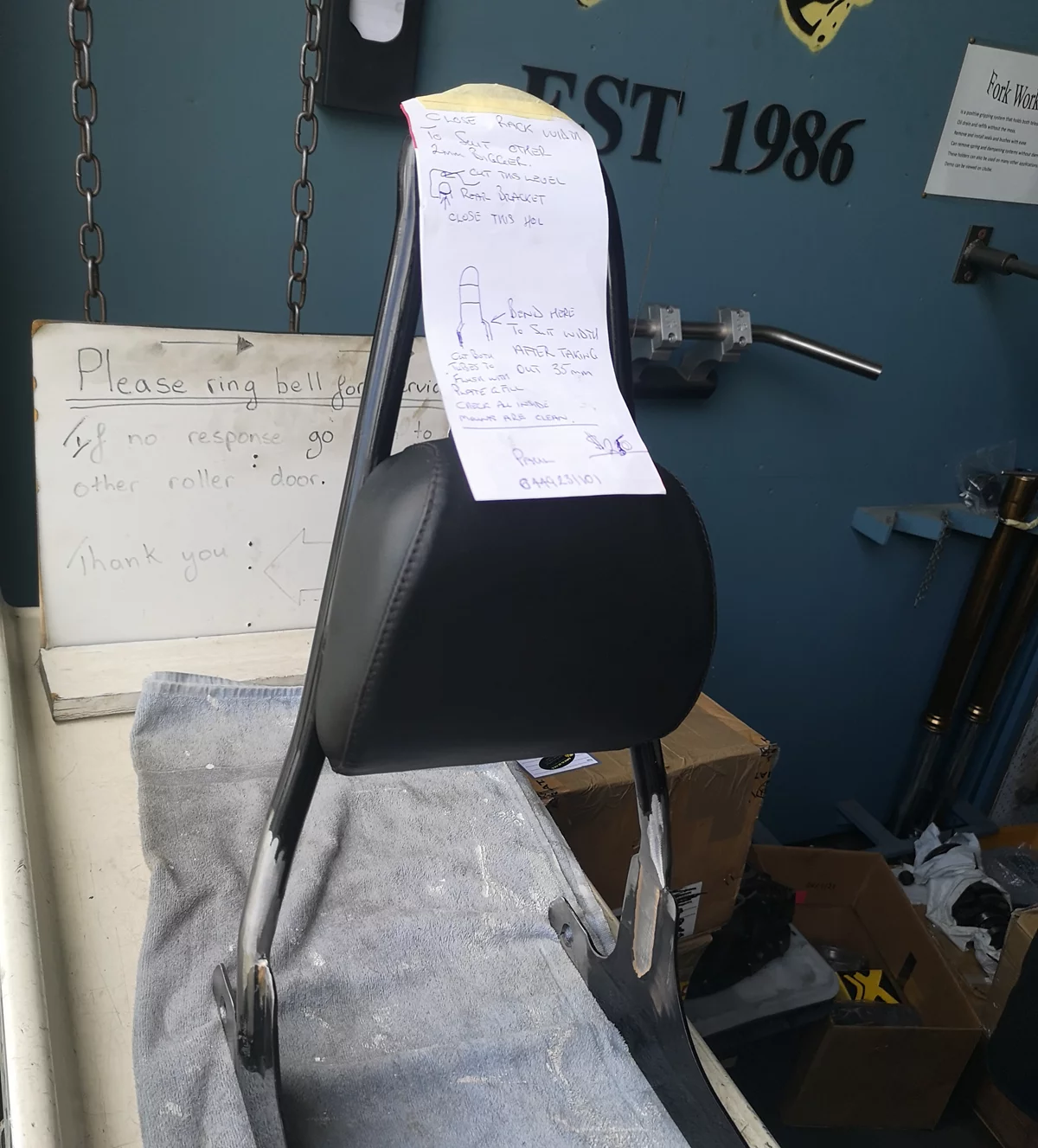 Wanting to install a sissy bar to visually complement the rear of the motorcycle, I encountered two main difficulties. The first was the altered turn signals at the rear to which the backrest attaches. The second was the excessive height of the backrest, which protruded higher than the handlebars creating a large gap between the backrest cushion and the passenger seat.